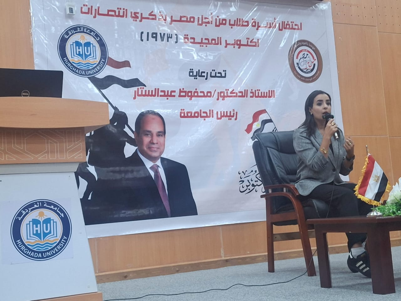 نظمت أسرة «طلاب من أجل مصر» بجامعة الغردقة بالبحر الاحمر ندوة تثقيفية نثر اكتوبر والاوضاع الإقليمية استضافت خلالها الإعلامية هند الضاوي، بمناسبة احتفالات الجامعة بانتصارات أكتوبر المجيدة، وذلك بحضور الدكتور محفوظ عبدالستار رئيس الجامعة، واللواء ياسر حماية رئيس مدينة الغردقة، عمداء الكليات، وعدد من أعضاء هيئة التدريس وطلاب الكليات.